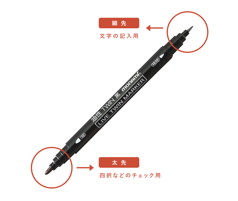 細いペン先は文字の記入用、太いペン先はチェック項目のマーキング用に使用してください。